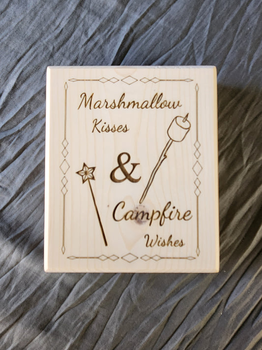 Block sign, Marshmallow kisses Campfire wishes